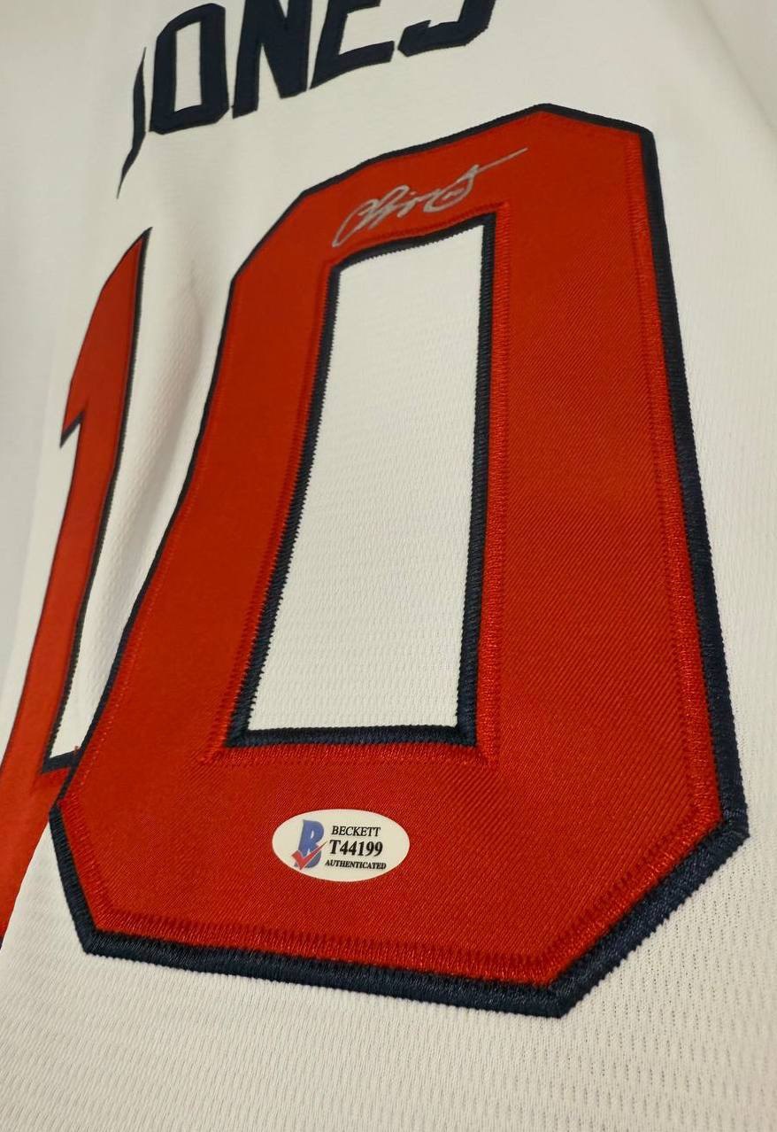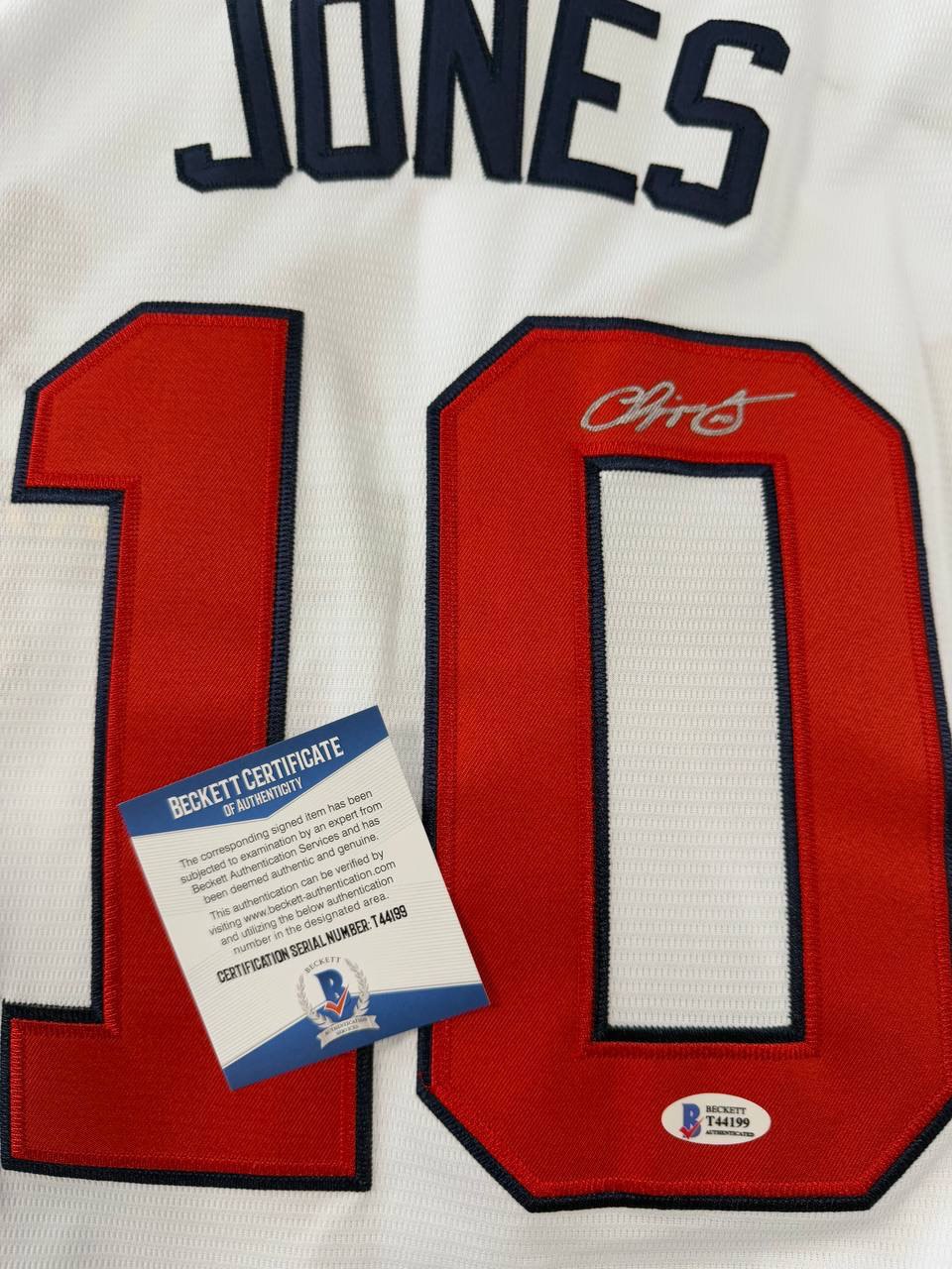 Presented here is an official Atlanta Braves game jersey, personally hand-signed by Chipper Jones. Its authenticity is certified by the industry-leading Beckett Authentication Services (BAS). This guarantees the jersey’s status as a genuine and hallowed relic from the career of one of the greatest switch-hitters and most respected competitors in baseball history.