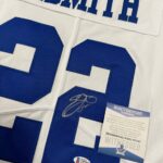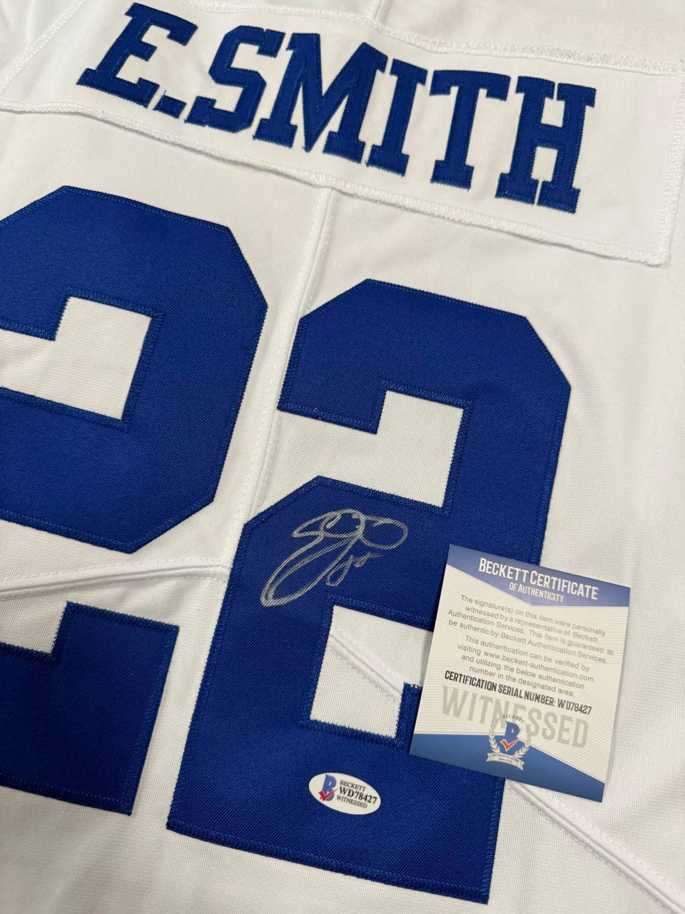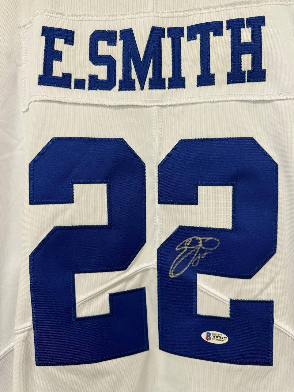 Presented here is an official Dallas Cowboys NFL game jersey, personally hand-signed by Emmitt Smith. Its authenticity is certified by the industry-leading Beckett Authentication Services (BAS). This guarantees the jersey’s status as a genuine and monumental relic from the career of the most prolific rusher in professional football history.