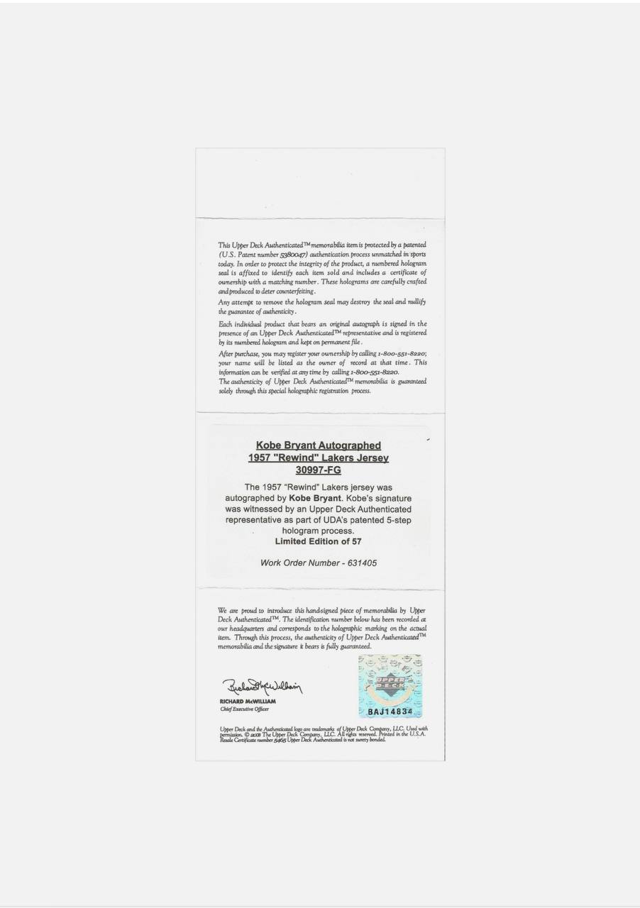Presented here is an official Los Angeles Lakers game jersey, personally hand-signed by Kobe Bryant. Its authenticity is certified by the premier memorabilia authority Upper Deck Authenticated (UDA), and includes a matching numbered Certificate of Authenticity. Upper Deck is renowned as the industry gold standard for direct athlete-signed collectibles, guaranteeing this jersey’s status as a genuine and hallowed relic from the career of a true basketball immortal.