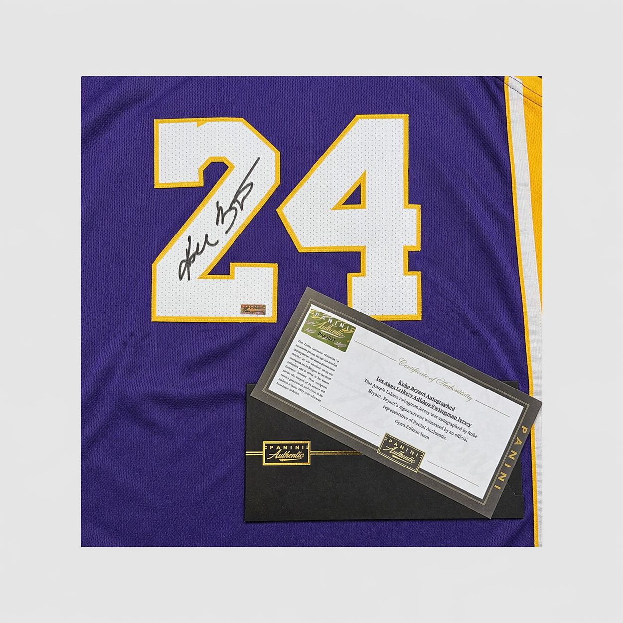 Presented here is an official Los Angeles Lakers game jersey, personally hand-signed by Kobe Bryant. Its authenticity is certified by Panini Authentic, the official trading card and memorabilia partner of the NBA, and includes a matching numbered Certificate of Authenticity. Panini is renowned as a leading authority in sports collectibles, guaranteeing this jersey’s status as a genuine and hallowed relic from the career of a true basketball immortal.
