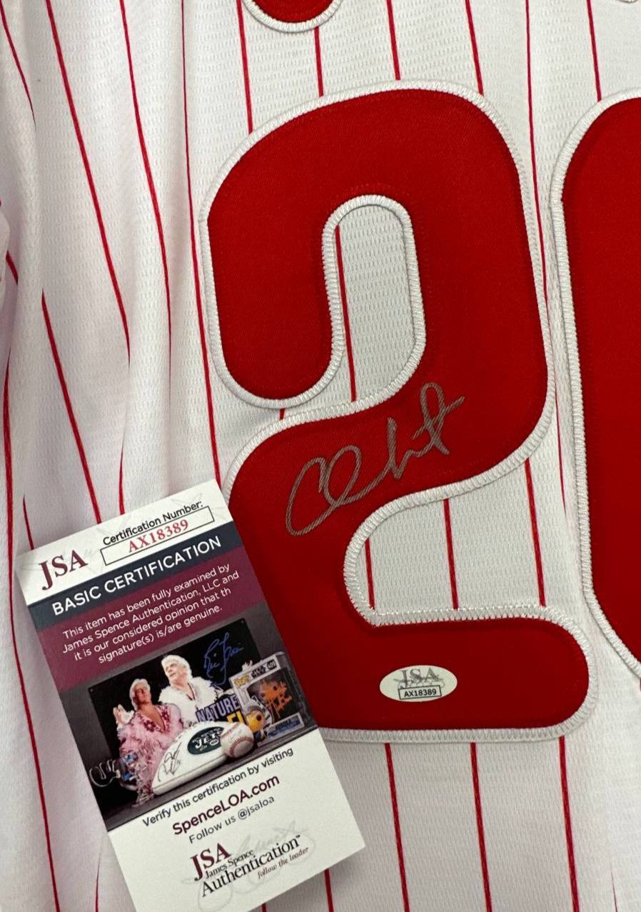 Presented here is an official Philadelphia Phillies game jersey, personally hand-signed by Chase Utley. Its authenticity is certified by the trusted verification of James Spence Authentication (JSA), one of the industry’s most respected authorities. This guarantees the jersey’s status as a genuine and treasured relic from the career of a player who embodied the championship spirit of a city.
